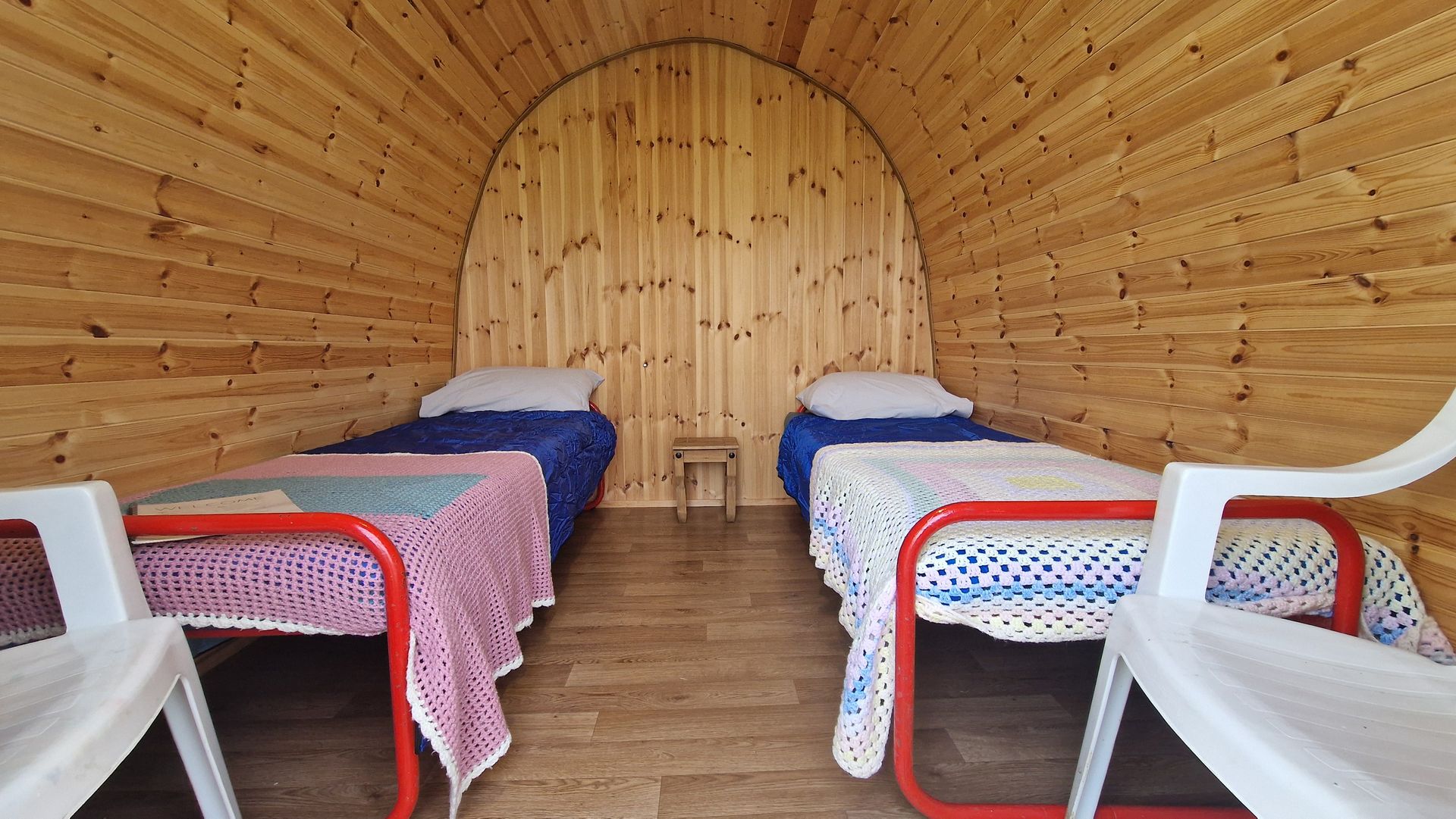 A basic pod on the campsite that is simply furished with two small single beds that can be pulled together for a double. Bedding, pillows, duvet etc are not included. Heating included.