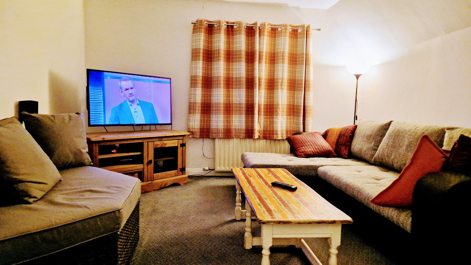 Living Room: Double Sofabed (L Shaped sofa, no bedding included), Smart TV, DVD.
